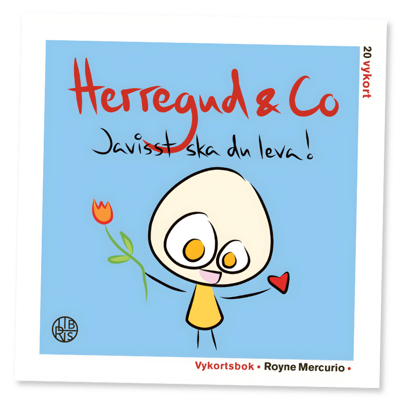Herregud & Co:s vykortsbok innehåller 20 olika färgglada bilder om kärlek, vänskap, vardag och fest som till exempel Hippeligrattishurra! Du är guld värd Du har just blivit kärleksbombad Du är som bacon! Allt blir bättre med dig! Lycka är att hitta någon som är lika knäpp som man själv!