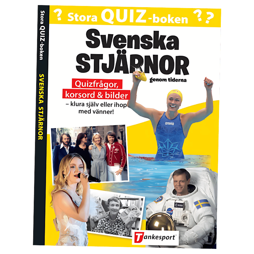 I Stora quizboken: svenska stjärnor kan du testa dina kunskaper om stora idoler genom tiderna inom såväl sport som på vita duken, teknik, musik, litteratur och konst.