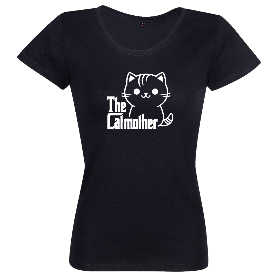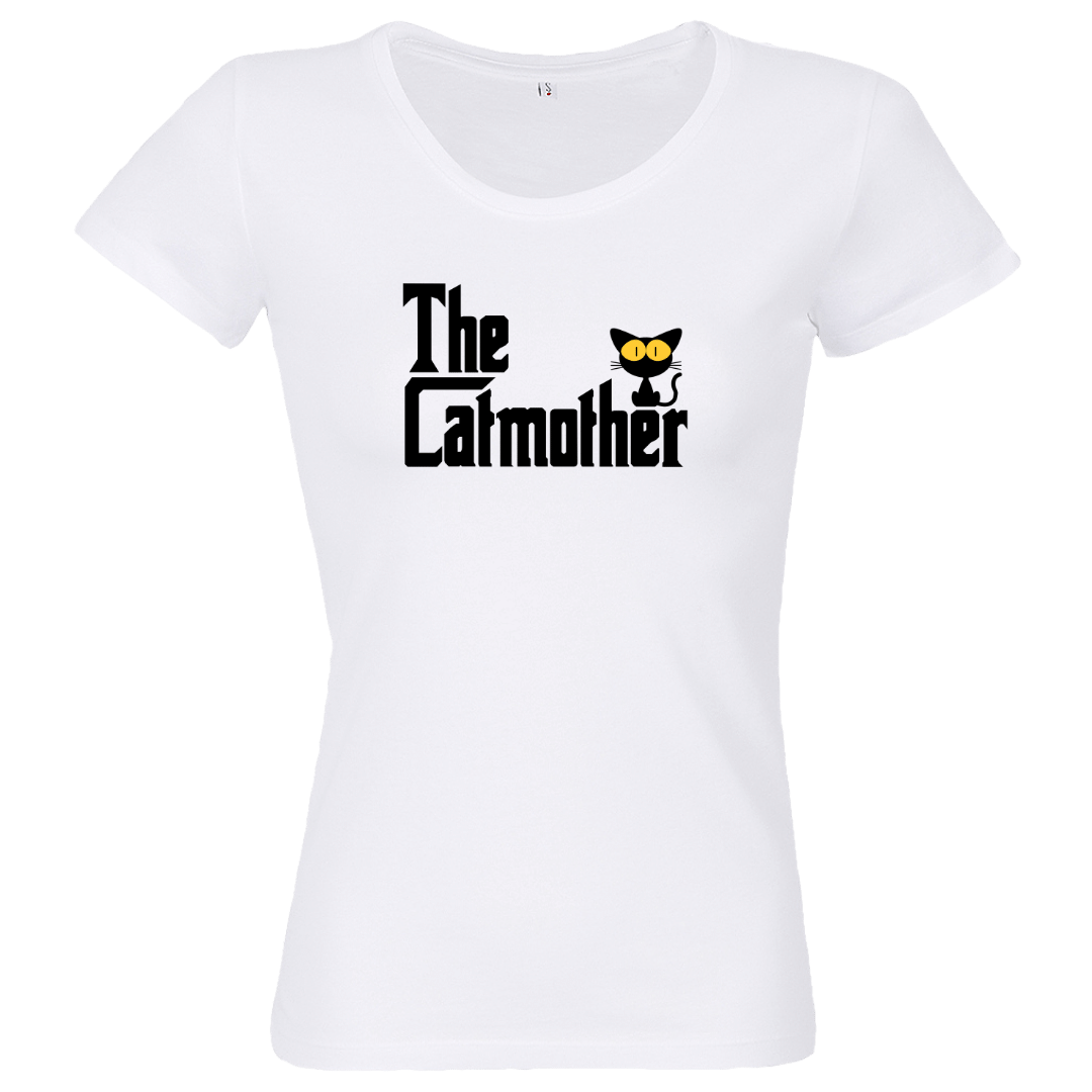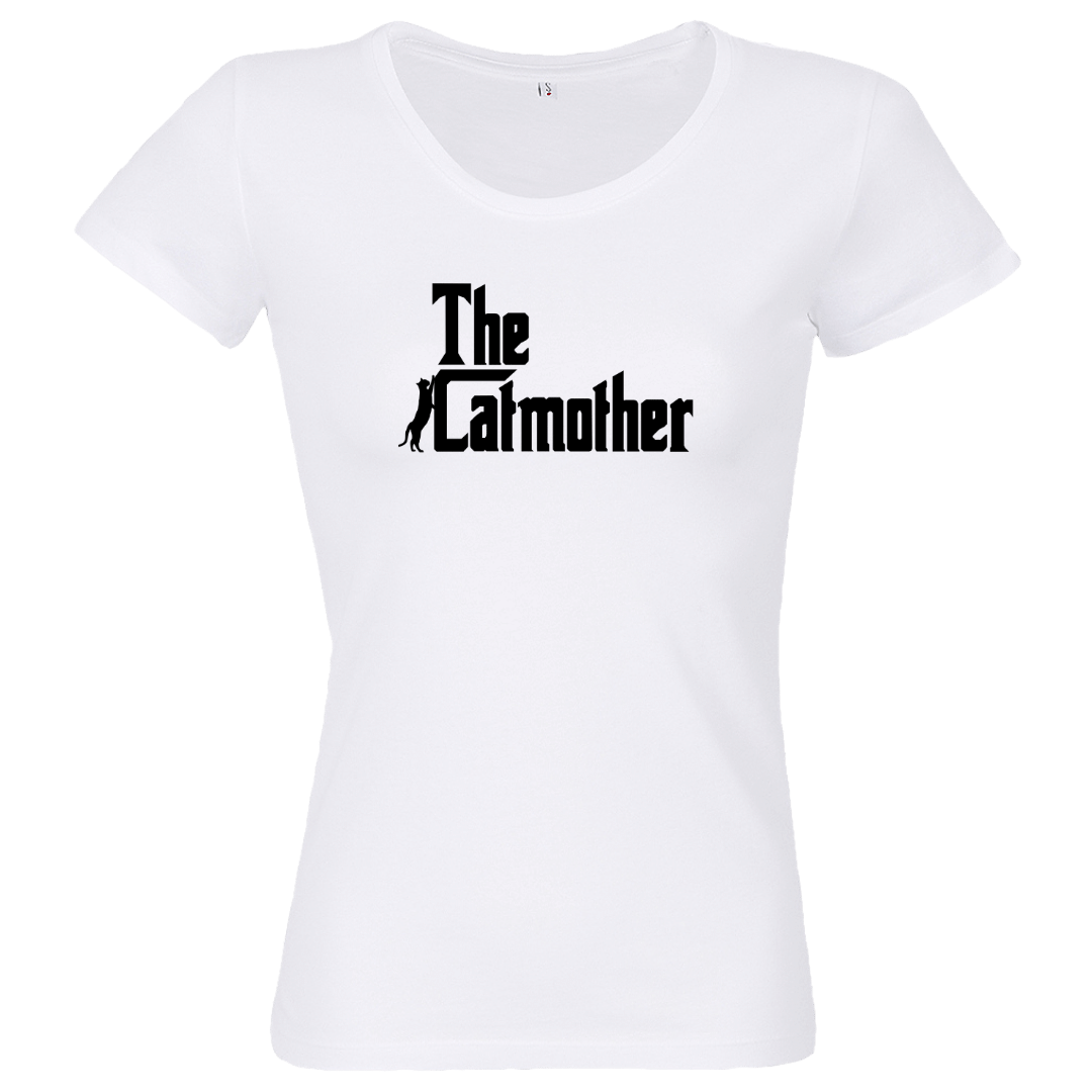 Beskrivning: Dammodell. Rundad hals, kort ärm och tryck framtill.